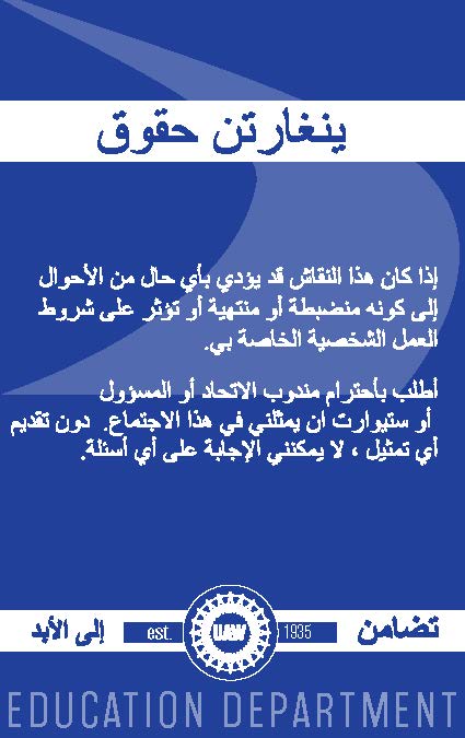 Translated in Arabic, this pocket-sized card is a powerful tool to have on hand whenever management is questioning you and you believe the answers to your questions may lead to discipline or affect your working conditions. This card can be ordered to be printed on paper, or on a durable plastic badge with a slit to secure to a lanyard.