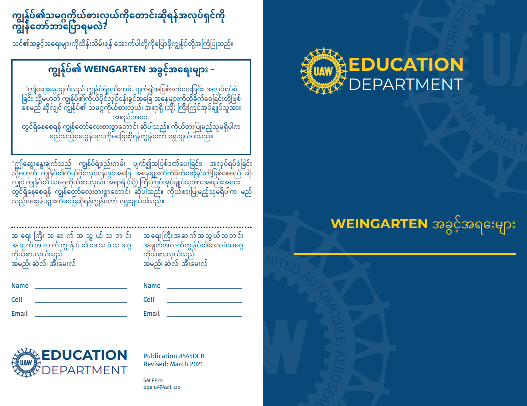 This tri-fold pamphlet is a great handout for local union Education Committees that teaches our members about their Weingarten Rights. Also available in Burmese (UAW Publication #545DCB).